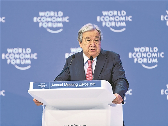 当地时间1月22日,古特雷斯在世界经济论坛2025年年会上表示,作为人类面临的两大挑战,气候变化和不受监管的人工智能扩张将颠覆人类生活,需要更多的关注和应对行动。图为当地时间1月22日,联合国秘书长古特雷斯在瑞士达沃斯举办的世界经济论坛2025年年会上讲话。