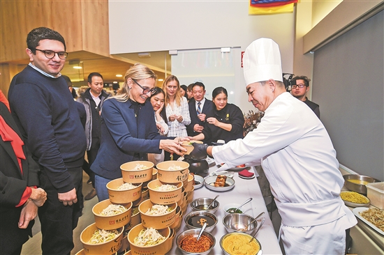 “‘你好,中国’重庆美食走进联合国旅游组织——‘渝味360碗’美食推介会”近日在位于西班牙首都马德里的联合国旅游组织总部举行。近百名嘉宾欢聚一堂,共品佳肴,体验中国的美食文化。图为人们在美食推介会上品尝美食。