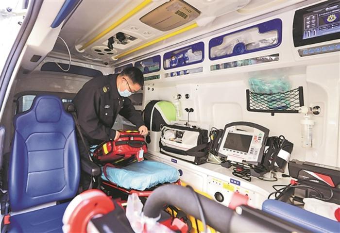 1月22日,急救医师在出发前检查整理救护车急救药品和装备。