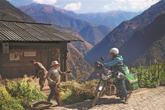 1月16日,在云南省怒江州称杆乡王玛基村的山路上,当地村民把刚摘下的豌豆送给还没吃午饭的桑南才品尝。桑南才在邮路上已经奔波了37年,乡里的家家户户几乎都与他相识。