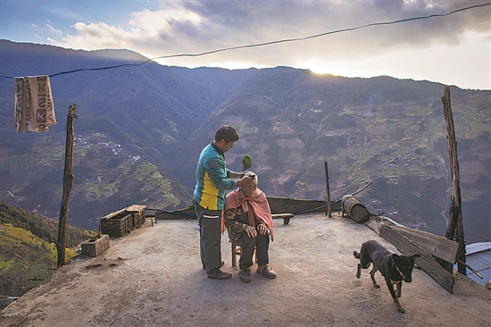 1月12日傍晚,前进村,近一个月没回家的桑南才为父亲理发。这里山高路陡,年迈的父母下山不便,桑南才夫妻俩一般隔几周才能回一趟父母家。