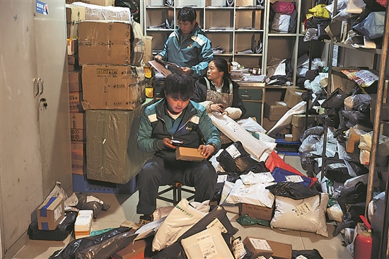 1月16日,在称杆乡邮政所,桑南才夫妇和侄子小飞三人一起加班分拣邮件。