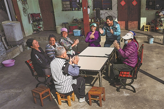 1月16日,在王玛基村村委会,桑南才(左二)与村民交流。