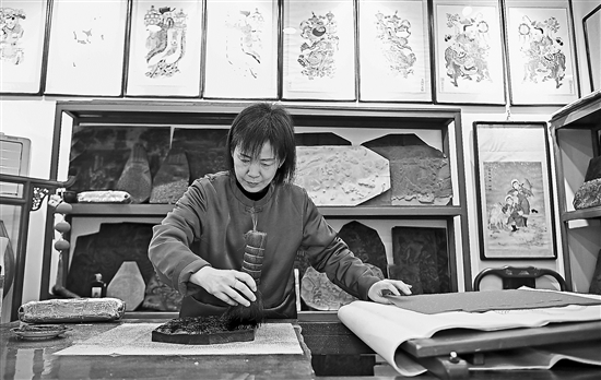 近日,在天津市西青区杨柳青镇玉成号年画坊,玉成号画庄第七代传承人张宏正在印年画。杨柳青木版年画是国家级非遗项目。临近春节,杨柳青木版年画推出生肖主题的年画,用非遗技艺烘托浓郁年味儿。新华社记者 孙凡越 摄