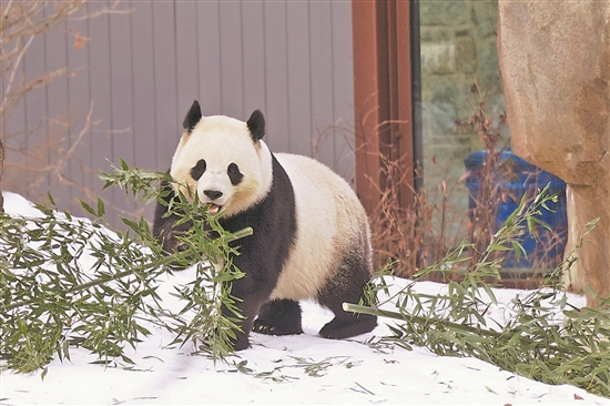 近日,大熊猫“宝力”在美国首都华盛顿的史密森学会国家动物园吃竹子。