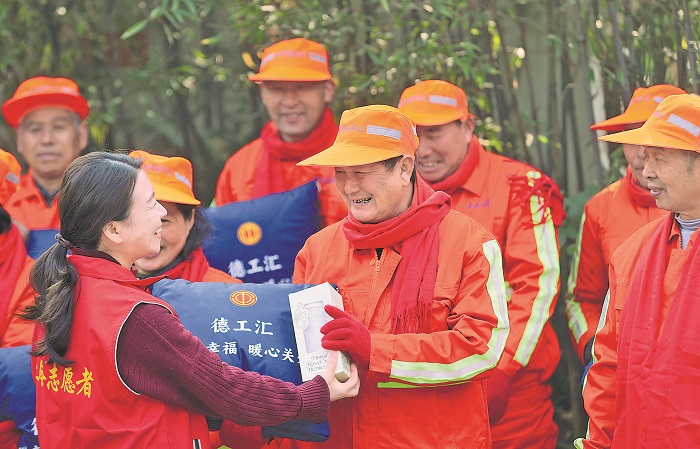 春节前夕,浙江省湖州市德清县总工会在阜溪街道工会驿站开展“新春礼包情暖劳动者”活动,向辖区180名环卫工人送上了围巾、手套、冬衣等暖心礼包,表达节日问候。