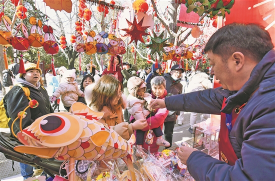 2月3日,北京市朝阳区非物质文化遗产灯彩扎制技艺代表性传承人马海捷(右)在地坛春节文化庙会上展示他制作的灯笼。