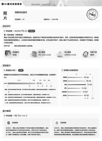 在刘磊看来,AI面试还能让用人方对求职者有更深入的了解。“用人方不仅能清晰看到系统生成的面试报告和综合评分,还能回放面试过程以及查看实时文字记录、求职者的临场表现、反应能力等。”