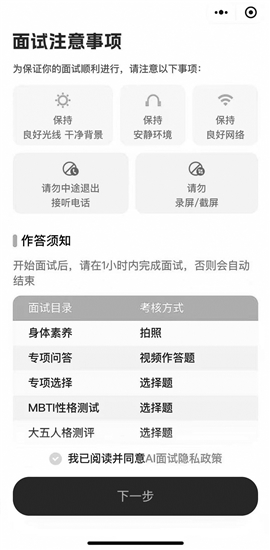 “AI测评共有5个模块,可分开作答,每个模块限时12~30分钟,收到邮件后5天内作答完成。”小蒲回忆说,面试设置看似人性化,但作答时很清楚自己是与机器人对话,感觉说什么都很假。
