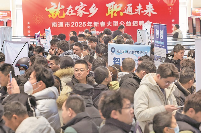 2月5日,江苏省南通市举行“就在家乡 职通未来”南通市2025年新春大型公益招聘会,140余家专精特新企业、国家高新技术企业、重点产业链企业等用人单位提供了5500多个就业岗位,涵盖机械制造、电子通信、生物医疗、纺织服装等行业领域。本报通讯员 许丛军 摄