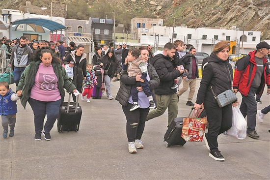 希腊旅游胜地圣托里尼岛附近海域近日频发地震。据希腊媒体当地时间2月5日报道,截至4日晚间,已有上万人撤离圣托里尼岛。图为民众在希腊圣托里尼岛轮渡码头准备乘坐船只撤离。