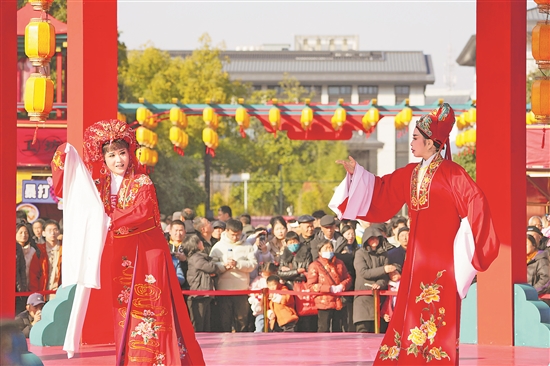 图为在绍兴市越城区,演员在“绍兴古城过大年”活动上表演越剧《何文秀》选段。新华社记者 翁忻旸 摄