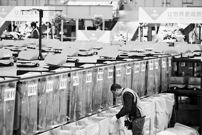 2月5日晚,浙江省湖州市德清县乾元镇第一产业智慧物流园区快鱼服饰有限公司华东物流中心,工人在封包分拣“小黄人”机器人配送的服饰。当天是该物流中心春节假期后首个工作日,880台“小黄人”分拣机器人在双层桌面上来回穿梭,分拣服饰近9万件。