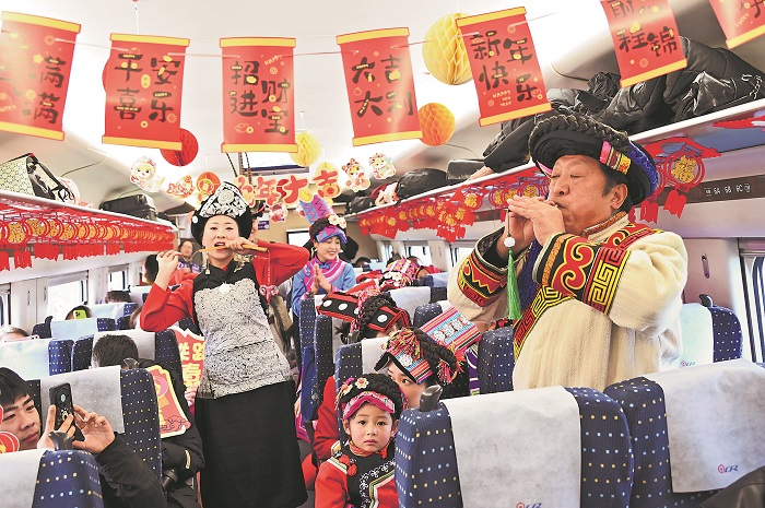 C5812次列车上演羌笛口弦合奏。成都铁路局供图