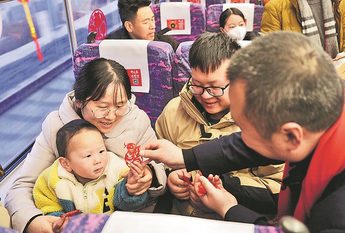 近年来,类似形式的活动在全国各地备受推崇。今年是首个“非遗版”春节,春运期间,多地高铁非遗活动更加丰富多彩。在哈尔滨开往漠河的列车上,5名鄂伦春族非物质文化遗产代表性传承人生动展示桦树皮烫画、面塑、刺绣等非遗项目的独特魅力;在宁夏银川开往杭州西的G3189次列车上,一场以“看列车春晚,赏非物质文化遗产”为主题的活动让旅客体验了别样的年味;烟台南站开往北京南站的G1088次列车上,杨家埠木版年画、高密剪纸、潍县布娃娃等非遗项目一一亮相,车厢内装饰一新,充满了浓厚的文化氛围……“铁路+非遗”,这场关乎“诗与远方”的邂逅,为非物质文化遗产代表性传承人们提供更多的展示平台和机会,也为多彩传统文化走出“深闺”直达大众身边提供了更广阔的空间。
