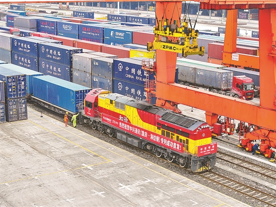 当日,重庆首次开行直达阿富汗的货运班列,也是中兴通讯阿富汗专列的全球首发,标志着重庆中亚班列线路得到进一步拓展,也为中国与阿富汗之间的经贸合作开辟了新的陆路通道。新华社记者 唐奕 摄