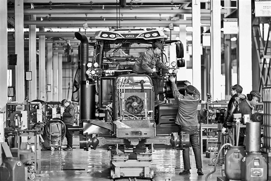 2月9日,工人在山东省青州经济开发区一家大马力拖拉机制造企业车间内装配作业。
