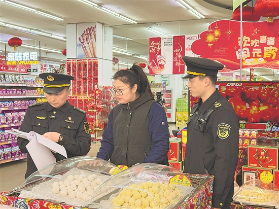 近日,北京市朝阳区市场监管部门在全区范围内开展元宵节专项执法检查行动。图为执法人员在京客隆超市久隆百货店开展检查。