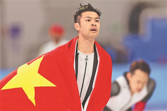 2月11日,宁忠岩在赛后庆祝。在当日进行的速度滑冰男子1000米比赛中,宁忠岩以打破亚洲纪录和赛会纪录的成绩夺冠。这也是宁忠岩继男子1500米冠军和男子短距离团体追逐冠军后拿到的第3枚金牌。本报记者 蔚可任 摄