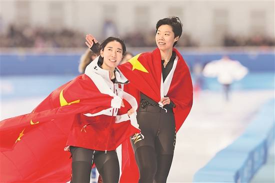 2月11日,韩梅(左)与队友殷琦在赛后庆祝。在当日进行的速度滑冰女子1000米比赛中,韩梅以1分15秒85获得金牌。本报记者 蔚可任 摄