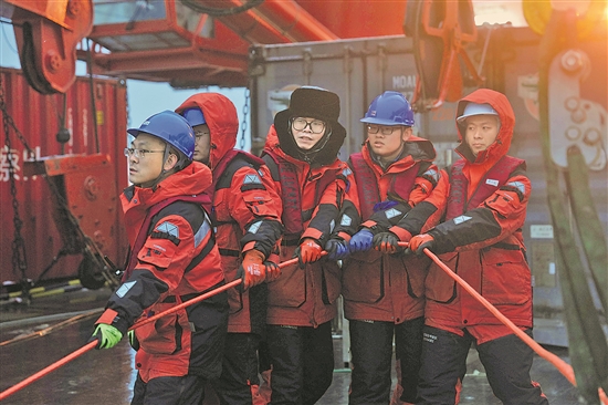 执行中国第41次南极考察任务的“雪龙2”号目前正在阿蒙森海开展大洋调查。元宵佳节,考察队举行了猜灯谜等活动,为队员们放松心情。图为考察队员们在控制潜标释放速度。新华社记者 黄韬铭 摄