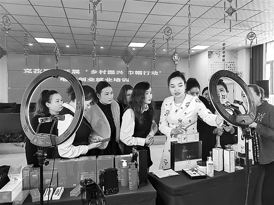 春节假期结束后,新疆阿克苏地区温宿县克孜勒镇的“乡村振兴巾帼行动”电商创业就业培训课程火热开班。在培训现场,来自各村的妇女群众在直播镜头前积极训练实操本领,认真学习电商营销技巧。