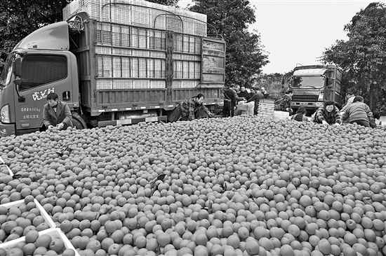 2月11日,四川省眉山市仁寿县宝飞镇民权村的果农正在将血橙柑橘分拣装车。