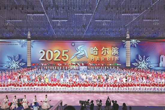 大屏幕上播放的短片《冬日奏鸣曲》开启了欢歌之夜。节目《冰雪结同心》在欢快舞蹈与恢弘交响乐的融汇中,尽显四季轮转、春到冰城的盎然美好。