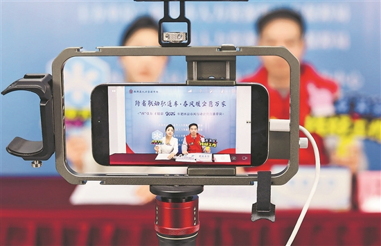 当日,安徽省肥西县与山西省阳泉市联合举办的“跨省联动职通车·春风暖企惠万家”活动正式启动。肥西多家企业借助直播平台,推介近300个就业岗位。2个小时的直播共吸引12万人次观看。本报通讯员 陈家乐 摄