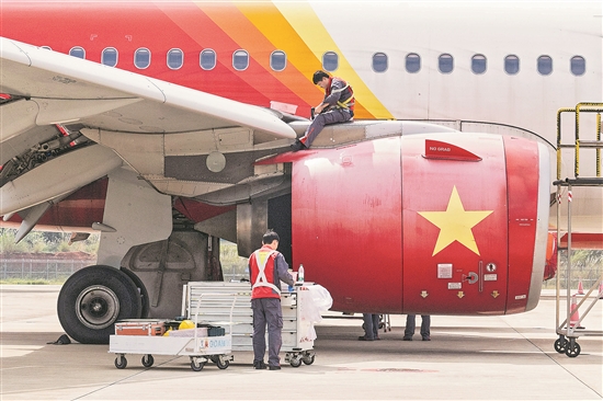 2月17日,在海南自贸港一站式飞机维修产业基地,海航技术旗下大新华飞机维修服务有限公司工作人员对进境飞机进行检修。