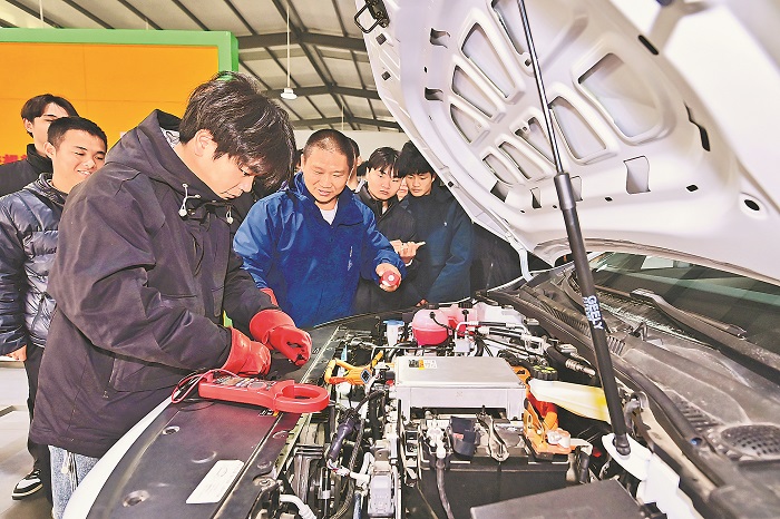 2月17日,江西省宜春市丰城市的一所技工学校实训基地内,新能源汽车运维专业学生在老师的指导下学习新能源汽车电池包检修技术。近年来,当地加快构建产教融合的职业教育体系,探索“以教促产、以产助教、产教融合、产学合作”的办学模式,将新技术、新工艺纳入教材,设置了新能源汽车技术、工业机器人应用、智能制造装备技术等一批紧缺学科专业和实训基地,不断满足社会和企业用工需求。本报通讯员 朱海鹏 摄