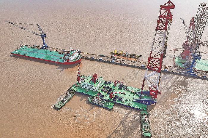 2月17日,“二航长青”轮在江苏启东正式开航,将开赴杭州湾跨海铁路大桥施工现场。据悉,“二航长青”轮是目前世界上最大打桩船,总长130.5米、型宽40.8米、型深8.4米、桩架高度150米,可打最大桩重700吨、直径7米的桩基。本报通讯员 许丛军 摄
