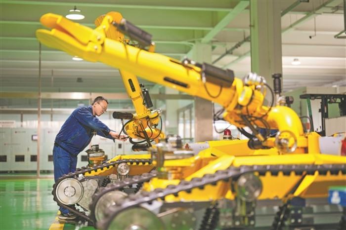 2月18日,工人在河北省唐山国家高新技术产业开发区中信重工开诚智能装备有限公司车间内调试机器人产品。