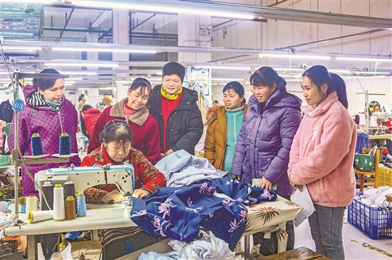 2月18日,在广西梧州市蒙山县新圩镇一家制衣企业车间内,新圩镇政府组织农民工参观。