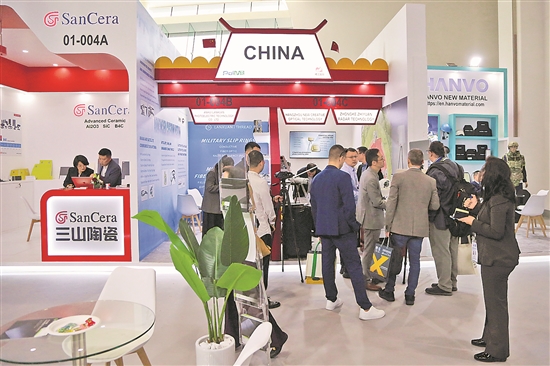 阿布扎比国际防务展和海军防务展近日在阿联酋阿布扎比国家展览中心开幕。全球多家顶级防务企业在展会上展示了最新的防务技术和解决方案。图为近日在阿联酋阿布扎比国家展览中心拍摄的防务展中国展区。新华社记者 温新年 摄