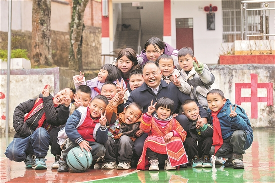 2月18日,农加贵和学生们在落松地小学操场上合影。
