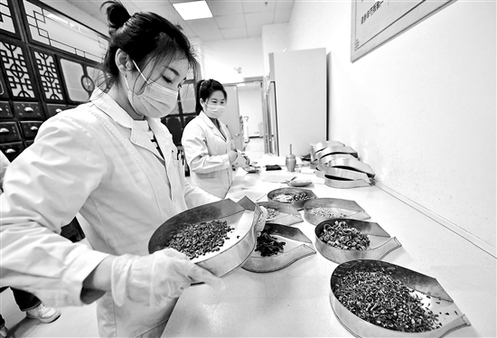 2月19日,在河北省深州市中西医结合医院“共享中药房”,工作人员在调配中药。据悉,深州市探索成立“共享中药房”管理系统,将这里煎煮、包装好的中药液,由快递员配送到各乡镇及村庄,让城乡群众在“家门口”享受到优质的中医药服务。