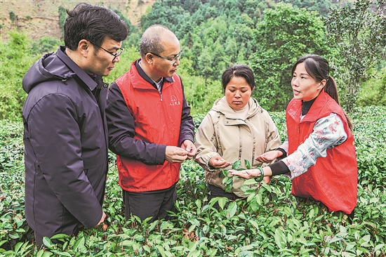 2月21日,广西梧州六堡茶核心产区,黑石山茶厂党支部书记石濡菲代表(右一)与梧州市中医医院创伤骨科副主任黎旭军代表(右三)在茶山走访调研。走访过程中,他们深入茶园,走进茶农家中与茶农交流沟通,了解各项政策落地情况,为乡村全面振兴寻觅“良方妙药”。本报通讯员 颜桂海 摄