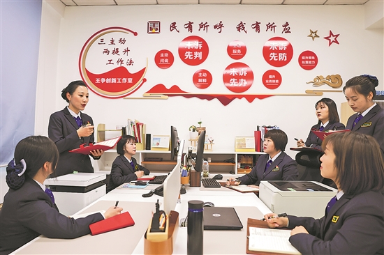 2月18日,北京市首发集团京开分公司榆垡收费管理所收费班长王争代表(左二)在自己的工作室与同事们探讨如何提升工作效率的相关问题。今年全国两会上,她将继续关注智慧交通建设的相关话题。