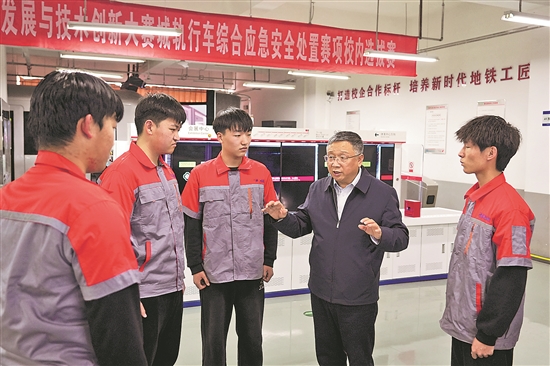 2月25日,河北石家庄,河北交通职业技术学院副院长张运凯委员(右二)在学院城轨智慧车站综合实训室与学生们一起交流。今年全国两会上,他将进一步深化建议内容,助力提高职业教育与区域产业发展的适配度。