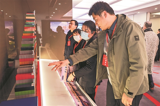 2月19日,在浙江宁波舟山港穿山港区展厅,宁波舟山港股份有限公司北仑矿石码头分公司卸船机班副班长郑国代表(右一)向前来调研的全国人大代表们讲解集装箱的发展历程。今年全国两会上,他将带来一份关于加快宁波舟山航运服务产业发展助力海洋强国建设的建议。本报通讯员 蒋晓东 摄
