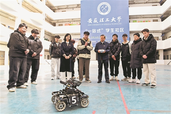 2月24日,安徽淮南,中国工程院院士、安徽理工大学校长袁亮代表(右五)与大学生探讨机器人研发应用的相关话题,征询师生关于学科建设的意见。今年全国两会上,他将提出关于加大对地方高校“五育并举”人才培养基础设施建设支持力度、支持安徽省筹建深地国家实验室、加大甲烷管控科技支撑等建议。