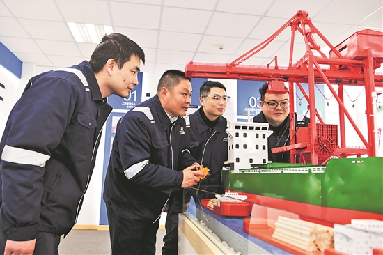 2月21日,江苏苏州,苏州港集团太仓鑫海港口开发有限公司门机班大班长褚锋代表(左二)在创新工作室和同事们一起研讨卸船机操作工作法。今年全国两会上,他将继续关注产业工人技能提升,让更多产业工人享受到改革带来的红利。