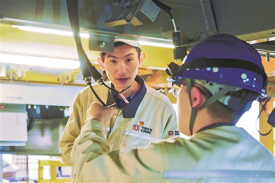 2月25日,山东青岛,中车四方股份公司钳工高级技师李文龙代表(图左)在动车装配现场与工友一起交流。他希望通过制定产业工人队伍建设的相关法律来完善终身职业技能培训制度,同时让首席技师享有同行业教授一样的待遇。
