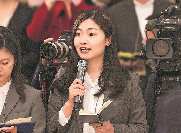 图为本报记者曲欣悦向中航工业特级技术专家、光电所研究员羊毅委员提问。本报记者 王伟伟 摄