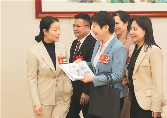 3月10日,在福建代表团全体会议结束后,宁德时代新能源科技股份有限公司高级技工王红梅代表(左一)向同团的十四届全国人大宪法和法律委员会委员李玉萍代表(左三)就下午的发言进行交流。