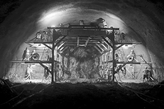 三观楼隧道全长5623米,最大埋深达882米,为渝昆高铁“出滇入川第一站”盐津南站的连接隧道。隧道地处滇东北乌蒙山区,喀斯特地貌发育,地质结构非常复杂,存在边坡顺层、顺层偏压、高地应力、岩溶、高地温、危岩落石、溜坍等诸多不良地质,施工难度大。经过中国铁建大桥局建设者们1200多个日夜的艰苦奋战,隧道终于顺利贯通。