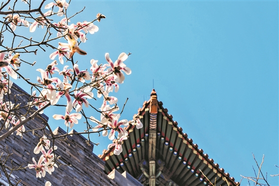 近日,北京春意渐浓,故宫城墙外玉兰花开放,与角楼建筑交相辉映。视觉中国 供图