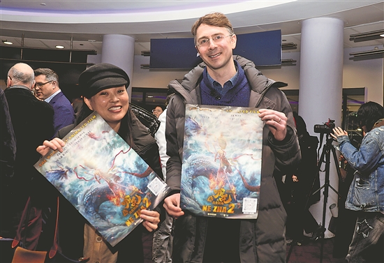 中国动画电影《哪吒之魔童闹海》近日在英国和爱尔兰开始点映,在欧洲影院迎来首批观众。图为近日在拥有英国最大IMAX银幕的伦敦BFI IMAX影院,人们手持《哪吒之魔童闹海》电影海报合影。新华社记者 李颖 摄