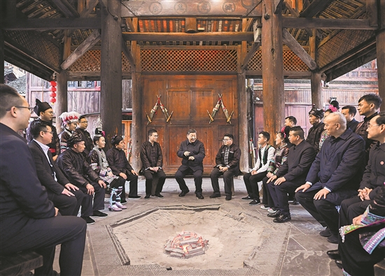 3月17日至18日,中共中央总书记、国家主席、中央军委主席习近平在贵州考察。这是17日下午,习近平在黔东南州黎平县肇兴侗寨考察时,同村民们亲切交流。 新华社记者 翟健岚 摄